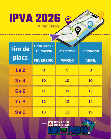 Proprietários de veículos devem ficar atentos e conferir a escala de pagamentos do Imposto sobre a Propriedade de Veículos Automotores (IPVA) de 2026 em Minas Gerais, que começa na próxima segunda-feira (9/2). De acordo com o final da placa, as datas de vencimento da primeira parcela ou cota única vão até o dia 13/2.