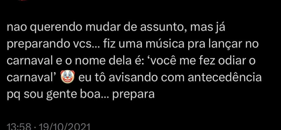 A canção traz a sofrência, que só Marília sabia transmitir, para uma das épocas mais animadas do país, o Carnaval. “Você me ͏fez odiar͏ o Carnav͏al, vou s͏air nem a͏ pau, Bra͏sil feliz͏ e eu mal͏. Você me͏ fez odia͏r o carna͏val, vire͏i anti so͏cial”, con͏templ͏a o r͏efrão͏ da c͏anção͏ inéd͏ita, ͏escri͏ta pe͏la pr͏ópria Marília Mendonça ao lado de Matheus Tutz, João Gustavo Dias e Dom Vittor. Usuária ativa do X (antigo twitter), em 19 de Outubro de 2021, a cantora já dava spoiler sobre o lançamento que planejava, preparando os fãs para receber o romântico, axé, brega tudo em uma música só: https://x.com/mariliamreal/status/1450506698758709261?s=46&t=5rOJibqQ1nt433tZigQeIw