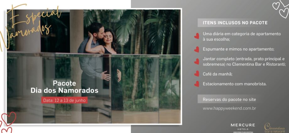 O Dia dos Namorados é a data mais aguardada pelos casais e com o dia 12 de junho se aproximando, aumenta a busca por experiências e presentes para comemorar o dia. Para aqueles que buscam um momento exclusivo, o Mercure Uberlândia Plaza Shopping já está com reservas abertas para seu pacote especial. Os valores do pacote são a partir de R$899 +3 % ISS por diária, variando de acordo com a acomodação escolhida e as reservas já estão abertas no link happyweekend.com.br.